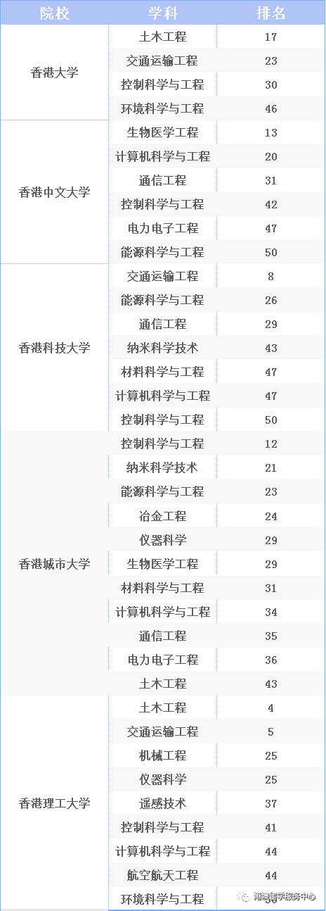 下面根据大学科领域,给大家整理了香港各高校进入世界排名前50的专业。